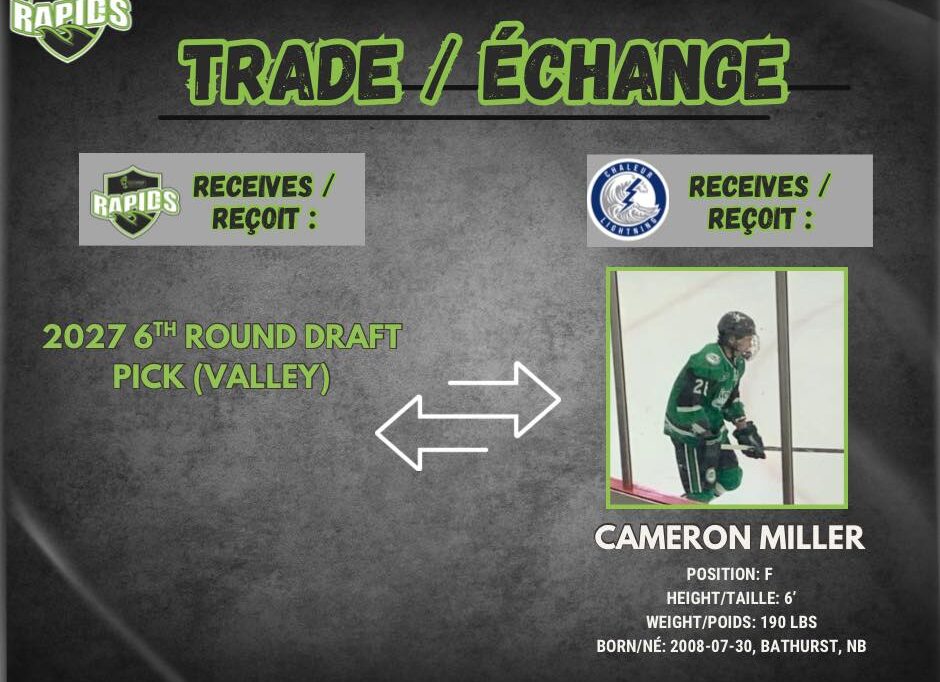 The Grand Falls Rapids have sent the rights of forward CAMERON MILLER to the Chaleur Lightning in return for a 6th round draft pick (Valley) in the 2027 MHL draft.