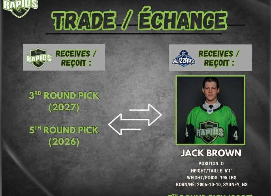The Grand Falls Rapids have traded defenseman JACK BROWN to the Edmundston Blizzard and a 7th round pick in the 2027 MHL draft.
